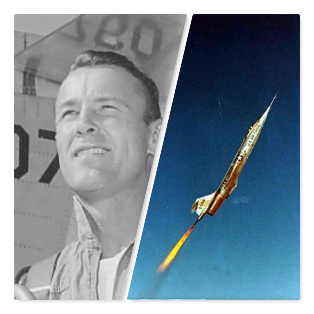 1963: Maj Robert W. Smith pilots the NF-104A Aerospace Trainer, with its ballistic controls (attitude control nozzles on the wing tips, nose, and tail) and a 6,000-pound thrust rocket engine, to 120,800 feet above